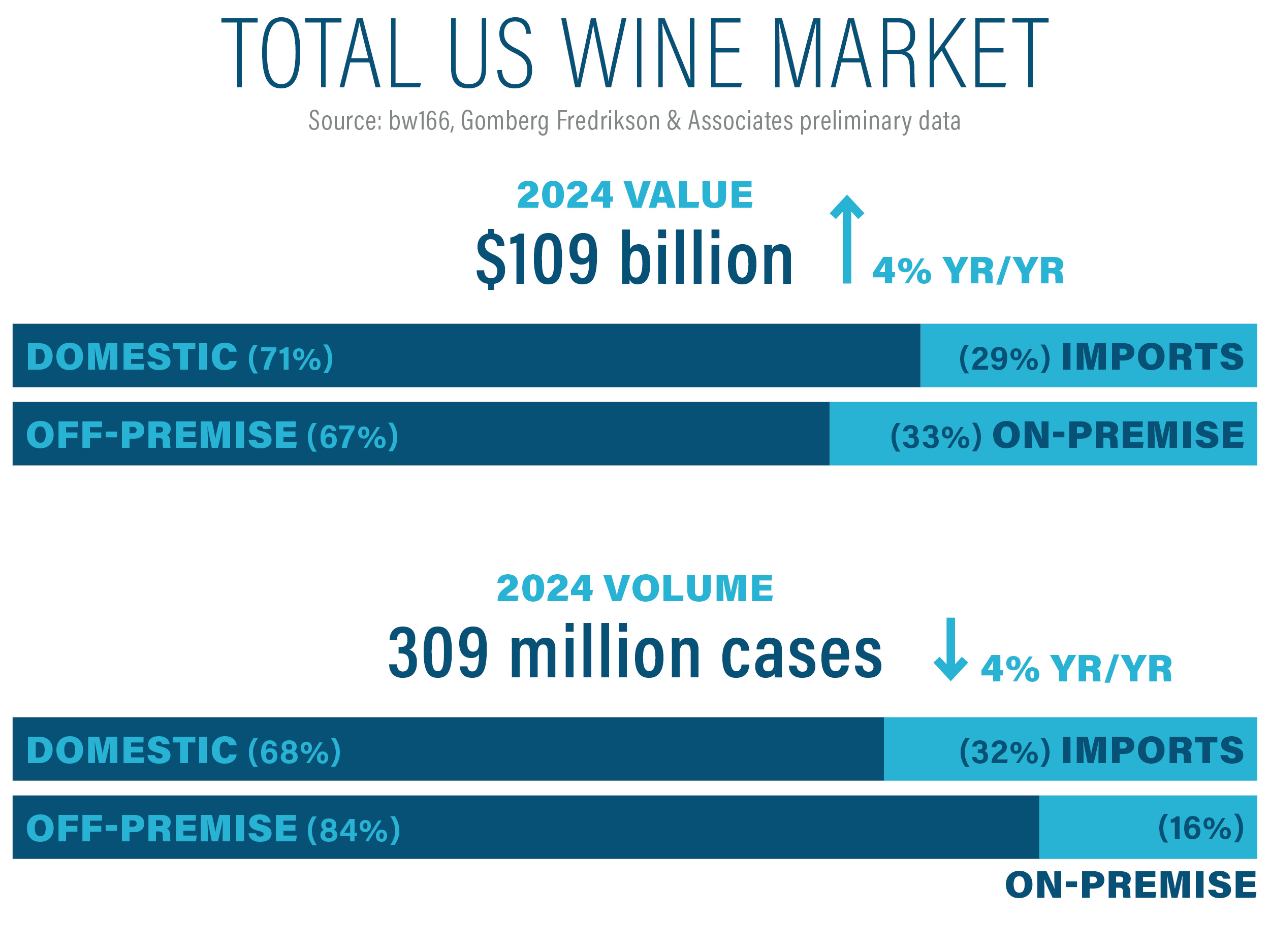 Business loves certainty. While the comparables to a year earlier were largely negative in 2024, the good news is that they were consistently so. NIQ off-premise scan data for the 52 weeks ended Dec. 28 indicated a drop of 4% versus a year earlier, with the momentum of the declines accelerating from a drop of 3% at the end of 2023. But with consumer behavior continuing to normalize and evolve, the shift was not entirely surprising. During his third-quarter review of shipment data, Gomberg, Fredrikson & Associates partner and editor Jon Moramarco heralded a turnaround in activity this year as accounts began to restock and right-size inventories for a new consumer cycle. “Ideally, by the end of the year retailers [that] have been destocking will have gotten to a point where they can’t reduce inventories anymore,” Moramarco said in his review of wine entering the market, including wholesaler inventory levels. “We will hopefully at least see this start to flatten out if not start to recover a bit in terms of growth.”